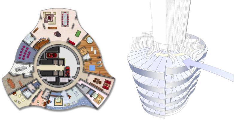 All’interno della torre girevole troveranno spazio un albergo a sei stelle, uffici e appartamenti di varie metrature e, negli ultimi piani, cinque ville da 1.500 mq cadauna. Ogni villa avrà a disposizione un posto auto al proprio piano servito da uno speciale ascensore. La villa Penthouse, la più prestigiosa, oltre a tutti comfort, disporrà di una piscina sul tetto, un giardino e un majlis, luogo tipico di incontro nel mondo arabo.